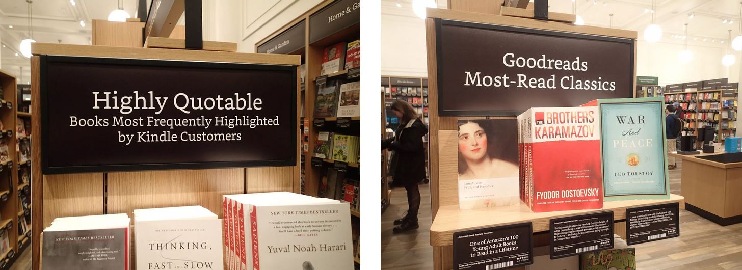 Cette façon de rendre très simplement tangible les algorithmes et les effets de rebonds propres au numérique est l’autre originalité du magasin. On la retrouve dans le mode de classement des livres et les sélections thématiques très nombreuses, disposées en tête de gondole, sur des tables et des présentoirs. Certaines catégories sont des plus classiques (classement par genre pour la fiction, grands domaines thématiques pour les documentaires, nouveautés, actualités diverses…), d’autres sont beaucoup plus originales : « Les livres les plus vendus à New York », « Tout le monde les cite : les livres les plus fréquemment surlignés par les propriétaires de Kindle », « Les livres avec plus de 10 000 commentaires sur Amazon.com », « les classiques les plus lus sur Goodreads », « Impossible à lâcher : livres lus en moins de 3 jours par les utilisateurs Kindle », etc.