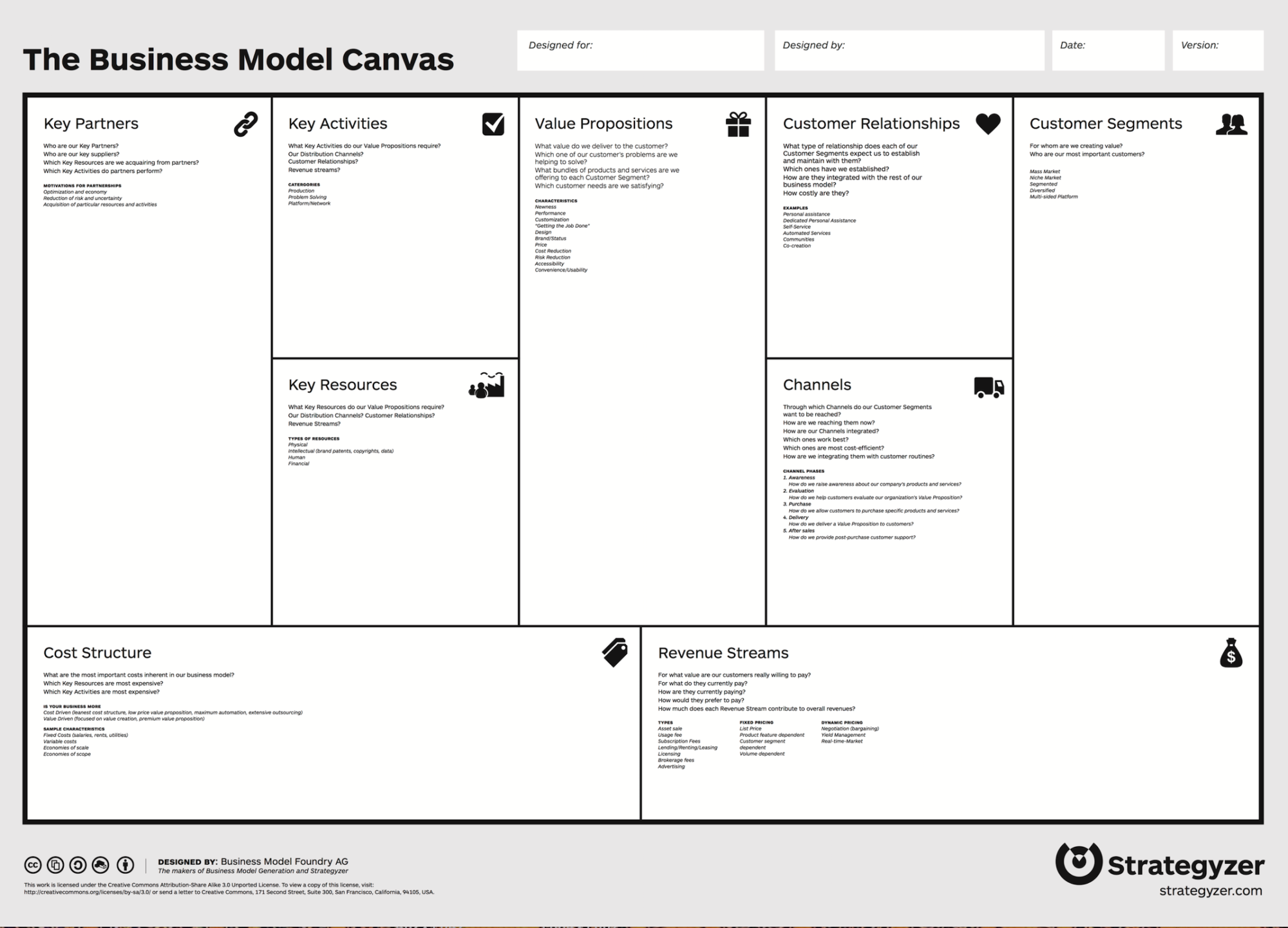 Dans le monde de l’entreprise, pour imaginer un nouveau concept commercial, on recourt parfois au business model canvas inventé par Alexander Osterwalder et Yves Pigneur. Il s’agit d’un tableau composé de blocs à remplir. Chaque bloc correspond à des questions auxquelles il faut répondre lorsqu’on crée une entreprise : à qui s’adresse-t-on ? Quels sont nos canaux de distribution ? Quels sont nos canaux de communication ? Quelles sont nos postes de recette et de dépense ? Etc.